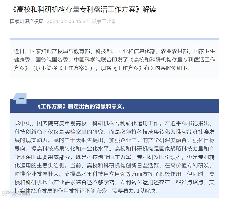 国家知识产权局与教育部、科技部、工业和信息化部、农业农村部、国家卫生健康委、国务院国资委、中国科学院于2024年1月26日正式联合印发的《高校和科研机构存量专利盘活工作方案》。