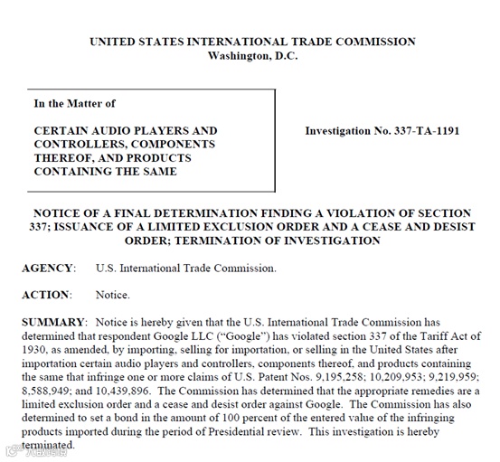 2020年2月,USITC对谷歌销售的涉及侵权的智能音箱产品展开337调查(调查案号为337-TA-1191)。