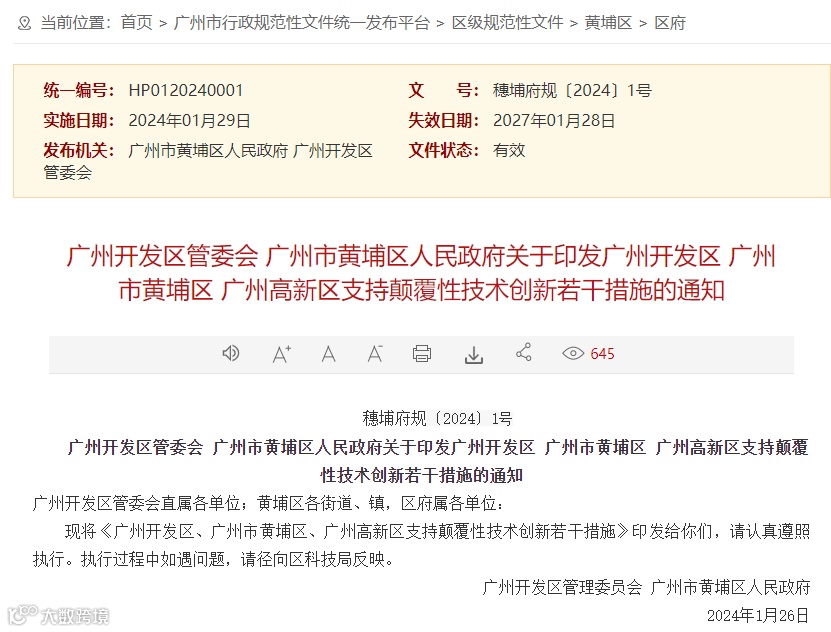 1、广州开发区管委会 广州市黄埔区人民政府关于印发广州开发区 广州市黄埔区 广州高新区支持颠覆性技术创新若干措施的通知https://www.gz.gov.cn/gfxwj/qjgfxwj/hpq/qf/content/post_9468444.html