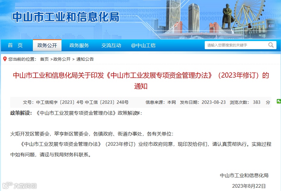 《中山市工业发展专项资金管理办法》(2023年修订)业经市政府同意,现印发给你们,请认真贯彻执行。实施过程中如有问题,请迳与我局财务科联系。