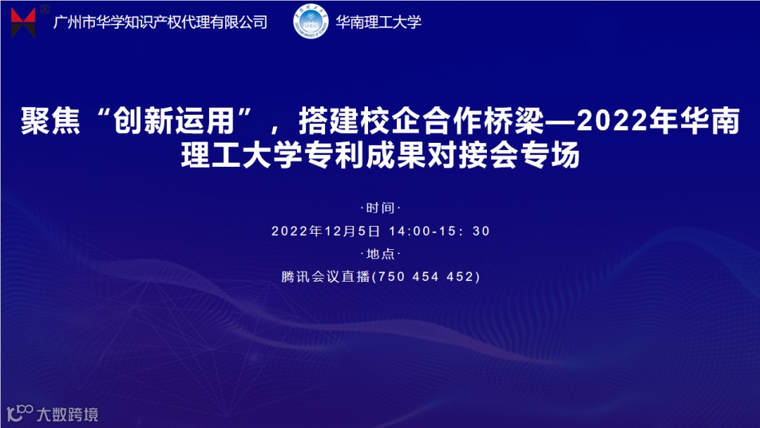 为对接中小微企业专利技术需求,助推中小微企业创新发展,2022年12月5日下午华南理工大学携手广州市华学知识产权代理有限公司成功举办专利成果对接会专场活动。