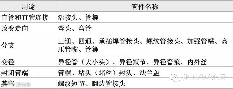 在管系中改变走向、标高或改变管径以及由主管上引出支管等均需用管件。由于管系形状各异、简繁不等,因此,管件的种类较多。常用的管件有弯头、三通、异径管、管接头、管帽等。