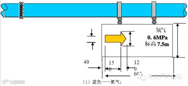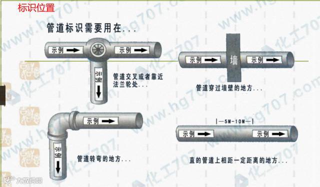 管道全长上标识; 在管道上以宽为150mm的色环标识,两个标识之间的最小距离应为10m,其标识的场所应该包括所有管道的起点、终点、交叉点、转弯处、阀门和穿墙孔两侧等的管道上和其他需要标识的部位,识别符号由物质名称、流向和主要工艺参数等组成。