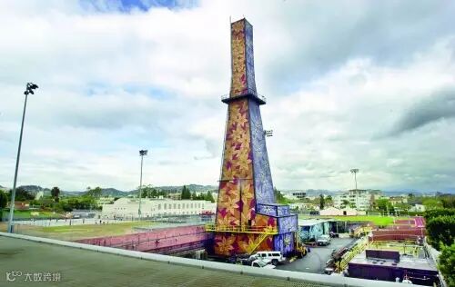 在比弗利山中学的棒球场旁边,有一座45米高、形状有点儿像埃菲尔铁塔的建筑物。它的表面覆盖着该校学生的画作——4种颜色、形状各不相同的花,象征着一年四季。色彩缤纷的画作之下,是一座油井井架。