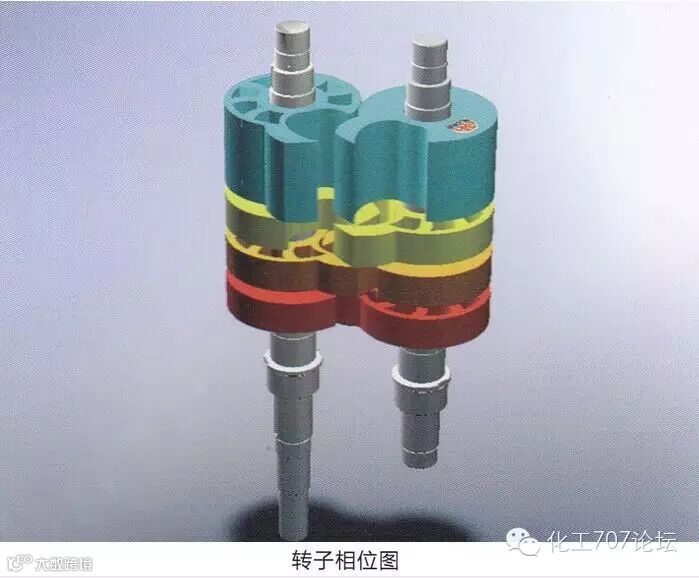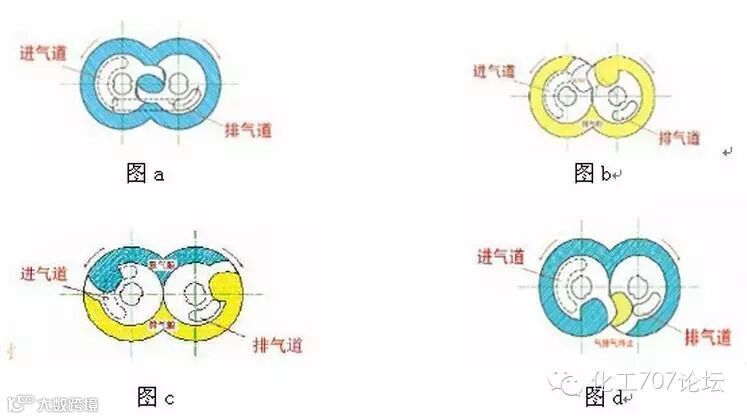 上图为罗茨转子由0°到360°的抽气过程。在0°位置时(图a),进排气道关闭,吸气腔与排气腔沟通,泵腔内压力均衡相等。当两个转子旋转到50°时(图b),形成负压腔,进气道打开,正压腔压力逐渐提高。工作过程中,此位置是转子正好处于换向泵腔压力平衡的瞬间,转子从该位置再转过一定角度,则转子开始密封分割为吸气腔与压缩排气腔两部分,此时开始做功。此位置进气口打开,随着转子的继续旋转负压腔容积逐渐增大开始吸气,排气腔容积逐渐减小,由于排气口尚未打开,因此气体被压缩,压缩量随排气口上线位置的变化而变化。当转子旋转到155°时,此时负压腔继续进气,排气道打开,开始排气。此位置时泵的吸气做功继续进行,排气口开始打开,被压缩的气体快速排入下一级泵腔。当转子旋转到312°时,进排气口关闭。此位置转子做功以完成一个周期,此时泵腔内压力逐渐恢复均衡状态。(图d)此位置又回到初始位置,随着泵转子的连续旋转,吸气和排气过程循环进行,实现了泵的连续抽气做功,实现了抽真空的目的。转子没转一周,吸气和排气各进行一次。