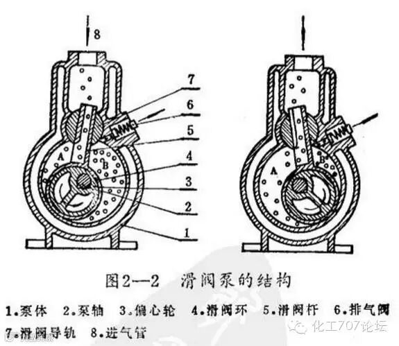 这种泵主要由泵体及在缸内作偏心转动的滑阀所组成。在泵缸中,装有滑阀环(4),其内装有偏心轮(3)。偏心轮固定在轴(2)上,轴与泵缸中心线相重合。在滑阀环上装有长方形的滑阀杆(5),它能在半圆形滑阀导轨(7)中上下滑动及左右摆动,因此泵缸被滑阀环和滑阀杆分隔为A,B两室,泵在运转过程中,由于A, B两室容积周期性地改变(极小与极大之间),从而达到抽气的目的。双级型的滑阀泵,实际上是由两个单级泵串联起来的,它的高、低真空室在同一泵体内,有的是直接铸造成一个整体,有的是压入中隔板来把泵腔分为高、低两室。但二者的前后两室均不直接有孔相通,而是高真空室把容器中的气体吸入经膨胀压缩后排到泵腔上部空腔,再由低真空室吸入经膨胀压缩过程排出泵外。