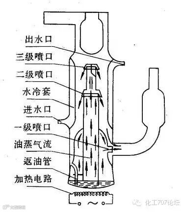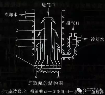油扩散真空泵,采用不锈钢内腔并含有纵向叠加的锥形喷射口的内室。通常有三个喷射口内室其大小逐个减小, 最大的在底部。在内腔的底部是一滩特殊的低蒸汽压油。油由内腔底部下设的电加热器加热煮沸,气化的油油向上移,从各个内室的喷射口排出来。而水通过在内腔外壁的循环使内腔降温,从而避免热量外溢并维持其长时间的运转。