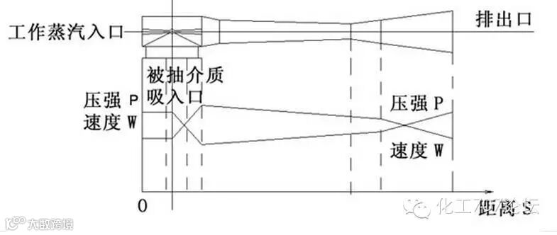 在绝热膨胀阶段,工作蒸汽通过缩放喷嘴后,压力能转化为速度能,以极高的速度进入扩压器,同时工作蒸汽的压力在喷嘴出口处下降,形成真空把被抽气体吸入;