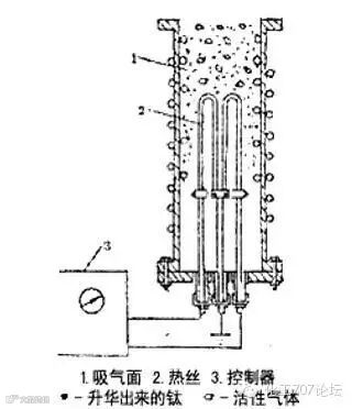 ①缠绕钛丝式升华器:将钛丝直接缠绕在钨杆或钽杆上,钨杆或钽杆通电加热到足够高的温度,钛就不断升华出来。