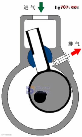 b)滑阀式真空泵:在偏心转子外部装有一个滑阀,转子旋转带动滑阀沿泵壳内壁滑动和滚动,滑阀上部的滑阀杆能在可摆动的滑阀导轨中滑动,而把泵腔分成两个可变容积。