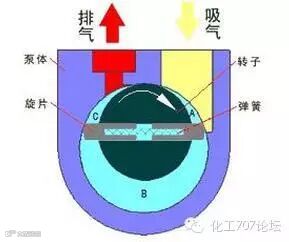 旋片泵的旋片把转子、泵腔和两个端盖所围成的月牙形空间分隔成A、B、C三部分,当转子按箭头方向旋转时,与吸气口相通的空间A的容积是逐渐增大的,正处于吸气过程。而与排气口相通的空间C的容积是逐渐缩小的,正处于排气过程。居中的空间B的容积也是逐渐减小的,正处于压缩过程。