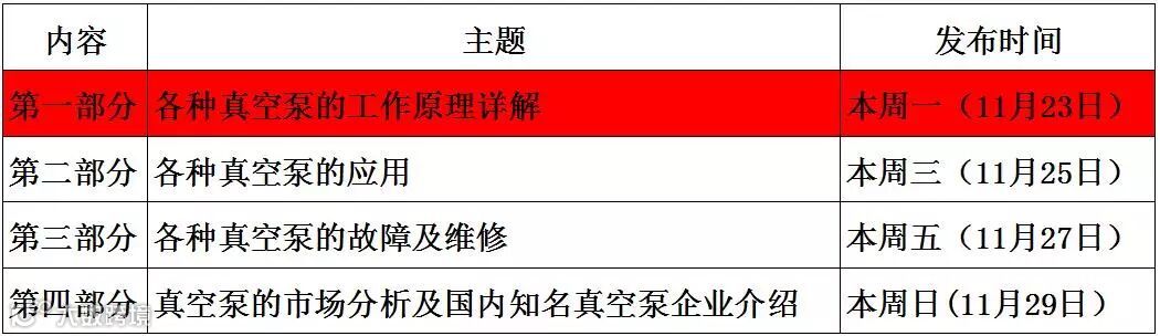 各位七友:对于小七整理的关于真空泵的知识点,分为以下几部分,后面将会一一呈送给大家,对于下面几部分知识点,大家有需要了解的可以给发消息到后台,小七将会在后期内容中回复你们的疑问。大家也可以踊跃向小七推荐你们所熟知的知名真空泵企业。以下是各内容点发布时间,七友们可别错过了。