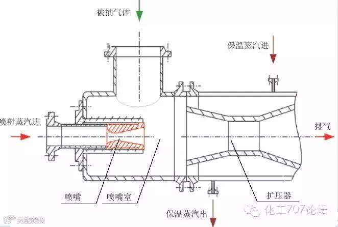 蒸汽喷射真空泵有一定压强的工作,蒸汽通过拉瓦尔喷咀,减压增速(蒸汽的势能转变为动能)以超音速喷入混合室,与被抽介质混合,进行能量交换,混合后的气体进入扩压器,减速增压(动通转化为压强能),为了减少后级泵的抽气负荷,配置冷凝器,通过有一定温差的两种介质对流,进行热交换,达到冷凝高温介质目的,排到大气压。(原理见下图)