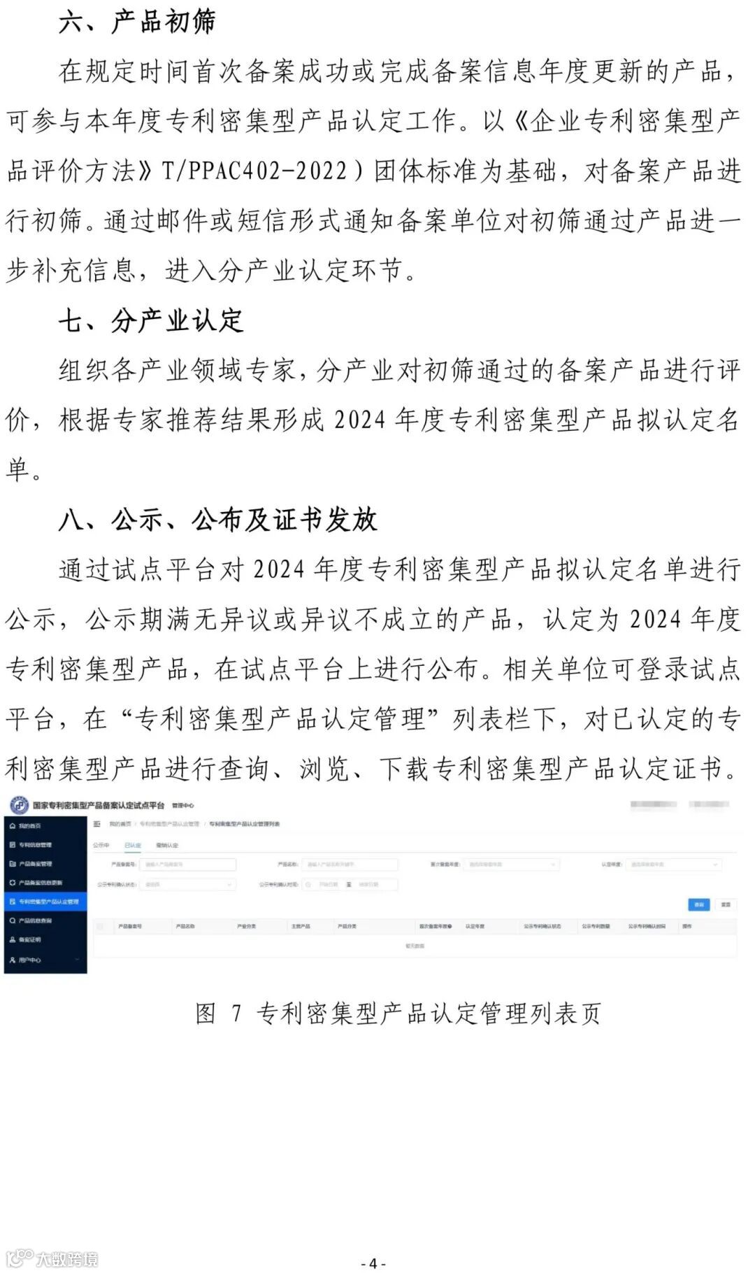 对2024年度专利密集型产品拟认定名单进行公示,公示期满无异议或异议不成立的产品,认定为2024年度专利密集型产品,并在试点平台上进行公布。相关单位可登录试点平台自行下载专利密集型产品认定证书。