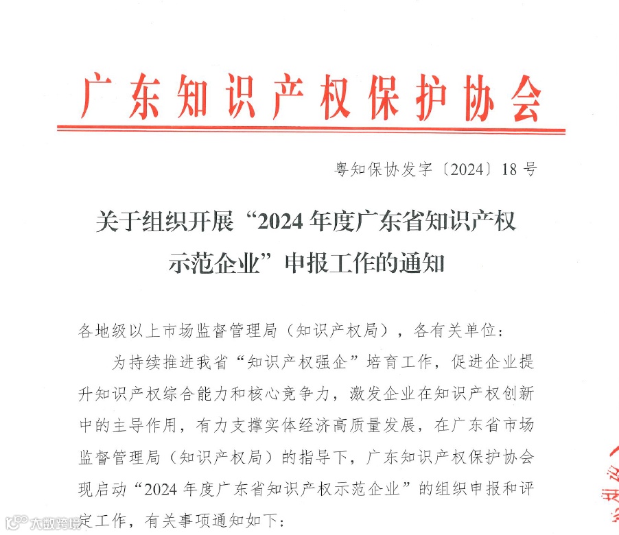 以上信息来源于:关于组织开展“2024年度广东省知识产权示范企业”申报工作的通知-广东知识产权保护协会网站 (