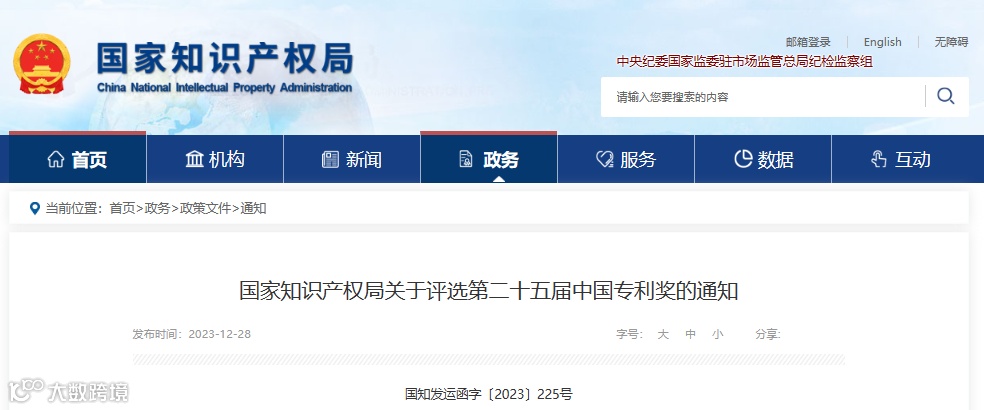 ▲国家知识产权局关于第二十五届专利奖的通知