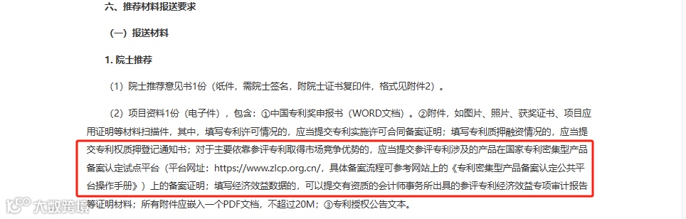 (1)第25届中国专利奖评选:主要依靠参评专利取得市场竞争优势的,应提交参评专利涉及的产品在国家专利密集型产品备案认定试点平台上的备案证明。