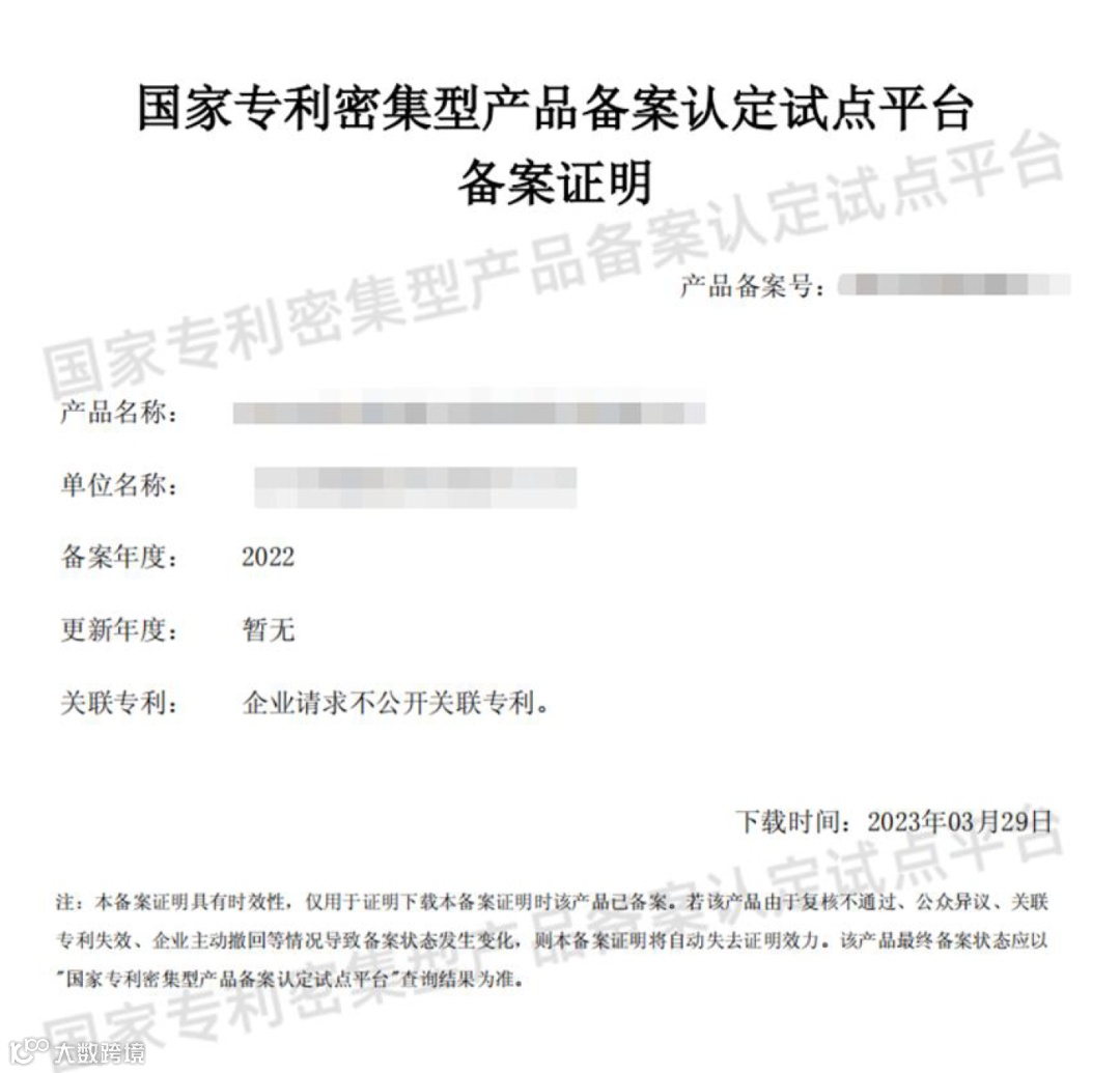 (2)被认定为专利密集型产品后可获得认定编码、二维码标识和认定证书。