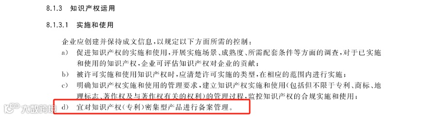 (3)企业知识产权合规管理体系(GB/29490-2023):第8.1.3.1 款提出宜对知识产权(专利)密集型产品进行备案管理。