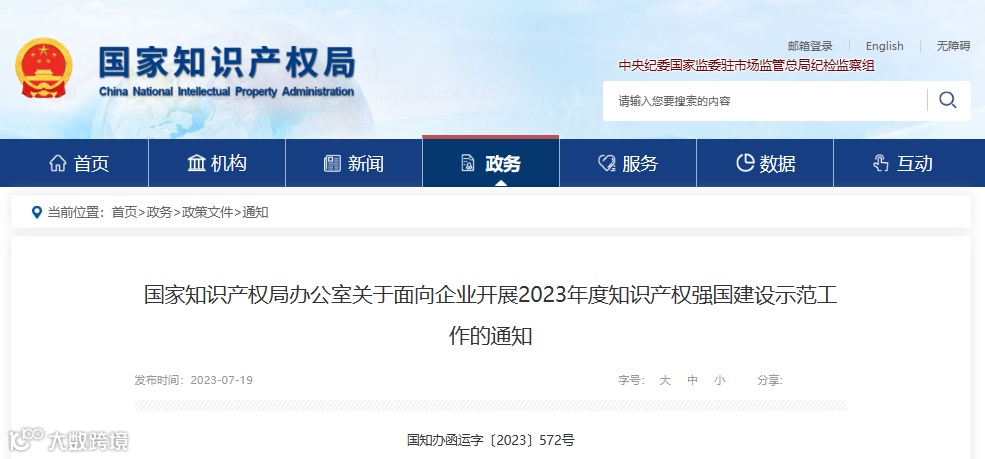 ▲国家知识产权局办公室关于面向企业开展2023年度知识产权强国建设示范工作的通知