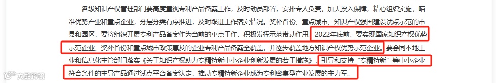②2022年底前,国家知识产权优势示范企业、奖补省份和重点城市政策惠及的企业专利产品备案全覆盖,并逐步覆盖地方知识产权优势示范企业。