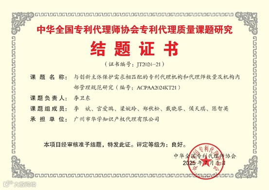 近日,华学承担的中华全国专利代理师协会研究课题——《与创新主体保护需求相匹配的专利代理机构和代理师数量及机构内部管理规范研究》、《专利代理在高价值专利形成、评估过程中的作用研究》,历经申报、开题、中期汇报、结题评审等多个环节,最终顺利通过结题评审,其中《与创新主体保护需求相匹配的专利代理机构和代理师数量及机构内部管理规范研究》课题获得“良好”的评定等级,《专利代理在高价值专利形成、评估过程中的作用研究》课题更获得“优秀”的评定等级!