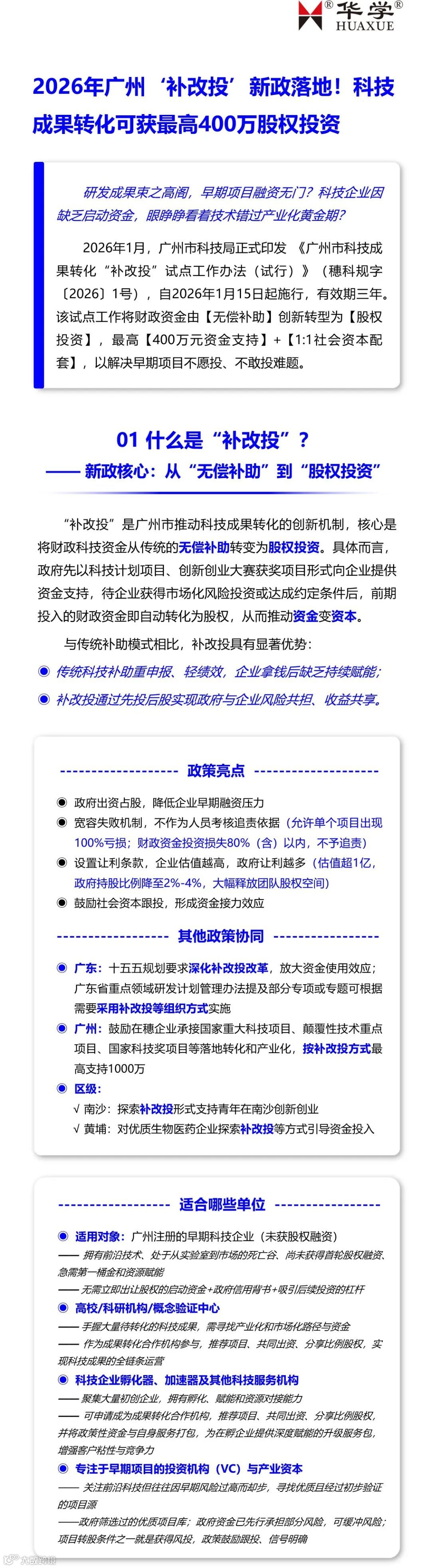 2026年广州‘补改投’新政落地!科技成果转化可获最高400万股权投资 华学知识产权