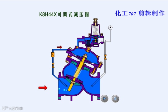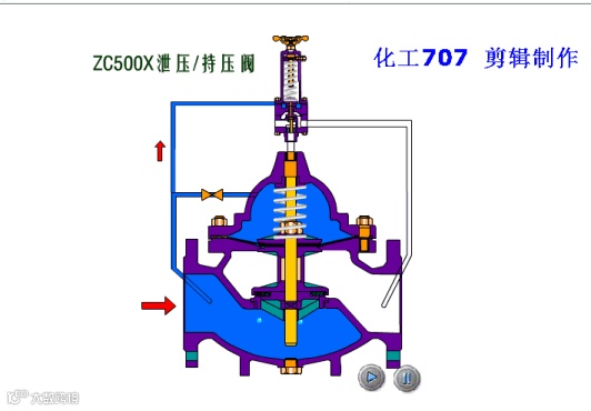 该阀安装在管道中,主要靠介质本身的能量保持阀后的压力和流量在规定的范围内。当压力低于或高于在导阀设定的规定值时,导阀会自动打开或关闭,释放或切断主阀控制室内的水压,从而控制主阀瓣打开或关闭,保证下游用水在正常的压力范围内。