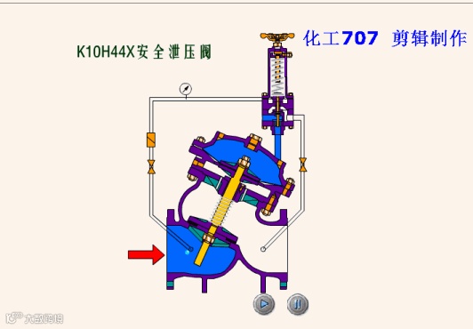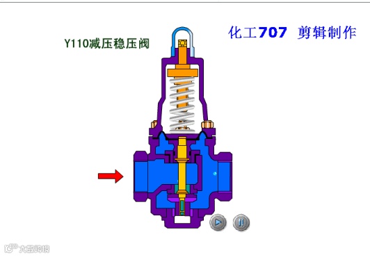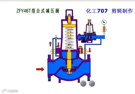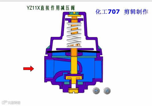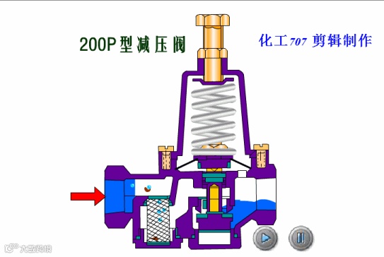 该阀安装于管路中,主要稳定出口压在设定的范围,保证出口的压力不因进口压力的变化而变化,当出口压力低于设定值时,阀瓣在弹簧力的作用下打开,水流通过,当出口压达到设定值时,出口压直接传递与膜片下方,与弹簧形成对抗,使阀瓣关闭切断通水。