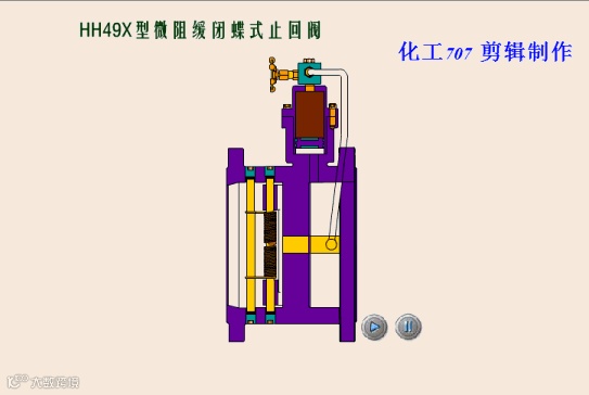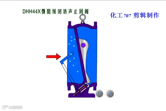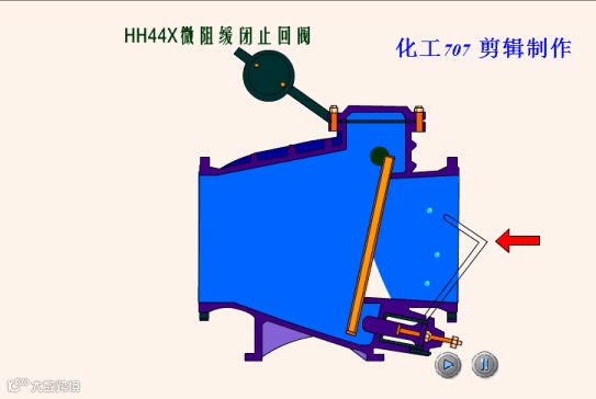 在阀门用于止排水管道,安装在水泵出口处,用来防止介质倒流或消除破坏性水锤,当水泵开始工作或防止压力开始升高时。阀瓣在进口压力作用下打开,介质大量通过,同时介质进入管壁气缸内,使活塞运动到工作位置,当水泵停止或进口压力下降时,阀瓣在回水压力作用下在先快速关闭百分之九十,由于活塞处于工作位置,剩百分之十左右的关闭形成,由活塞组织缓慢关闭,从而消除了快速关闭所形成的水锤。