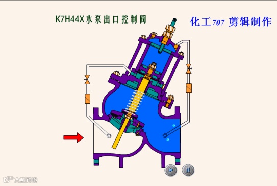 该阀安装于管路中,主要控制水泵停水时阻止介质逆流,并阻止因介质逆流所产生的水锤,保证水泵安全停泵,当水泵工作时,电磁阀通电处于关闭状态,主阀上控制室内的压力水经出口处单向阀流向下游,主阀瓣处于轻松工作中,当开始停泵时,主阀瓣再回流水的作用下快速关闭百分之九十,主控制室内的压力水由进口端补给,此时电磁阀的在形成开关的控制失电下被打开,控制内的压力水由出口端缓慢补给,从而使主阀瓣的剩余百分之十开度缓慢关闭,消除破坏性水锤。