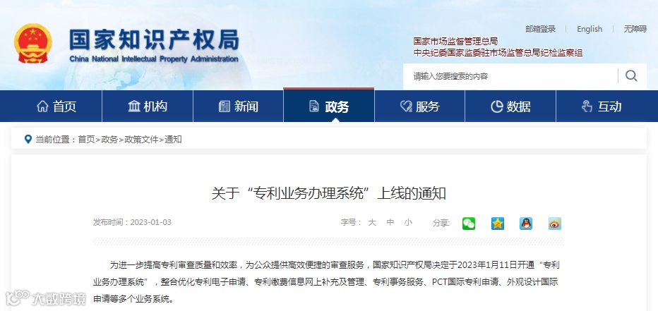 为进一步提高专利审查质量和效率,为公众提供高效便捷的审查服务,国家知识产权局决定于2023年1月11日开通“专利业务办理系统”,整合优化专利电子申请、专利缴费信息网上补充及管理、专利事务服务、PCT国际专利申请、外观设计国际申请等多个业务系统。