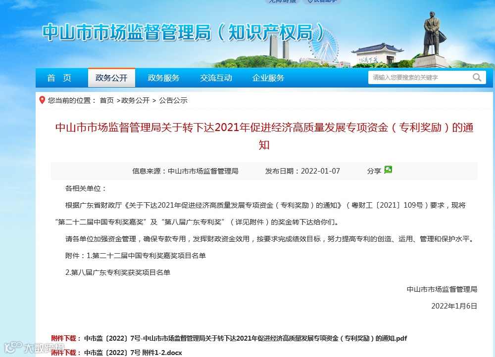 1. 中市监〔2022〕7号-中山市市场监督管理局关于转下达2021年促进经济高质量发展专项资金(专利奖励)的通知.pdf