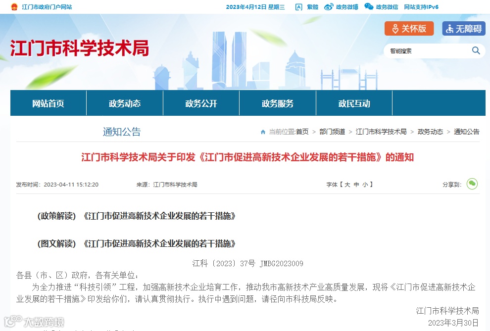 为全力推进“科技引领”工程,加强高新技术企业培育工作,推动我市高新技术产业高质量发展,现将《江门市促进高新技术企业发展的若干措施》印发给你们,请认真贯彻执行。执行中遇到问题,请径向市科技局反映。