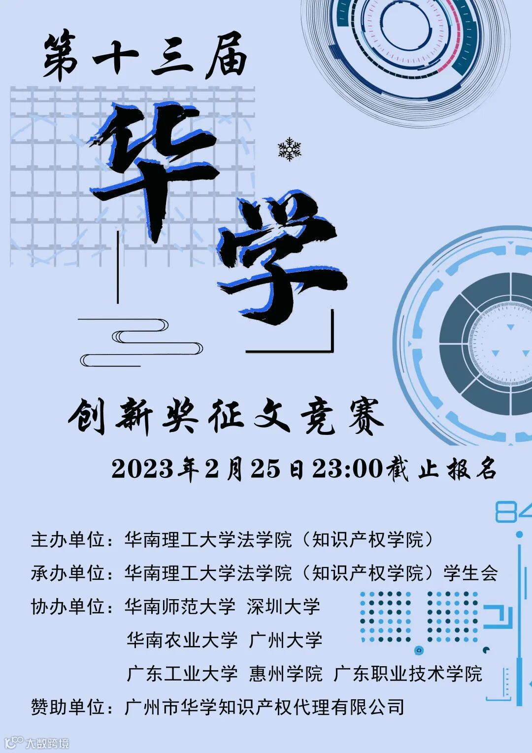 再次感谢华南师范大学、深圳大学、华南农业大学、广州大学、广东工业大学、惠州学院、广东职业技术学院等高校的加入,具体安排详见各学校活动宣传。同时我们也欢迎所有对知识产权感兴趣的同学参与到本次活动中。期待在2023春暖花开时与您在“华学”温暖相会!
