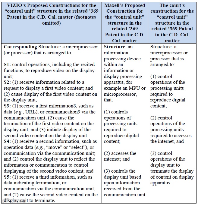 Vizio在这场由Maxell发起的专利诉讼中采取多种抗辩思路积极应诉。例如在加州中区地方法院的诉讼中,Vizio就涉案专利’369的“输入单元”、“控制单元”的定义与Maxell展开争论,试图通过缩小这些术语所涵盖的功能范围来证明其专利技术并未落入Maxell相关专利权的保护范围。审理过程中,Maxell声称,Vizio对输入单元、控制单元的术语解读存在误区,而Vizio则认为Maxell扩大了术语的功能范围。法院最终驳回了Vizio对定义的解释,很大程度上采用了Maxell更为简化的定义版本,认为这些术语解释涵盖了专利所保护的技术。以下为Vizio、Maxell以及法院对“控制单元”的术语解释: