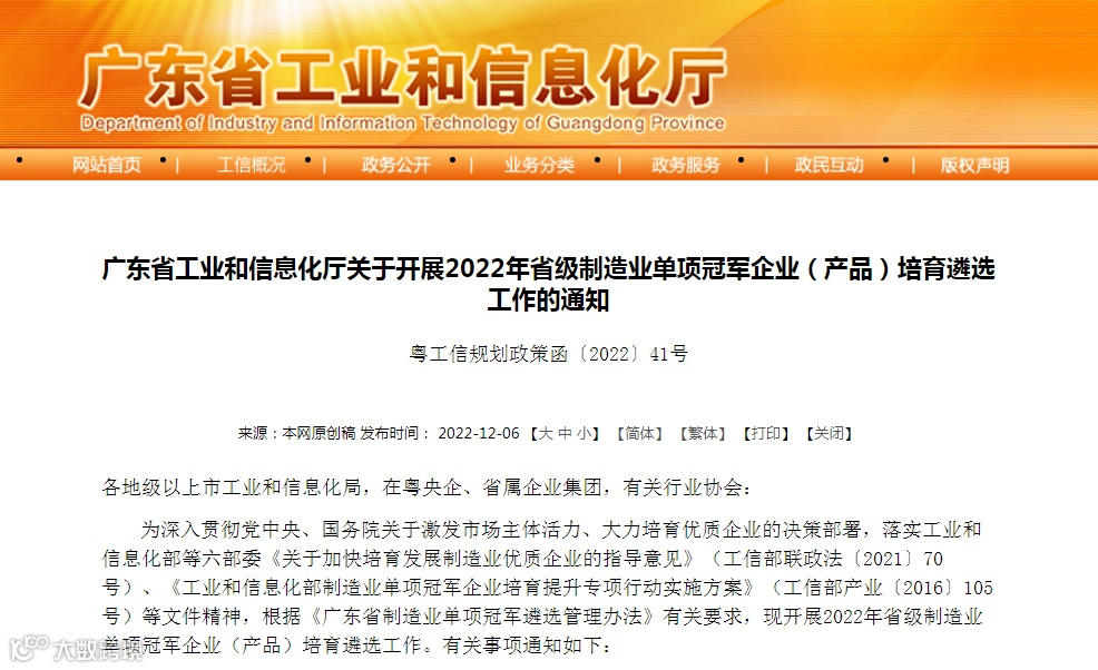 (四)我厅汇总申报材料后,将委托第三方专业机构组织专家组按照公平、公正、公开的原则,依照遴选细化指标体系对审核材料进行专家评审。根据专家评审结果,拟定遴选名单,并在官方网站进行公示,公示期为7个工作日。公示结束后,公开发布广东省制造业单项冠军遴选结果。