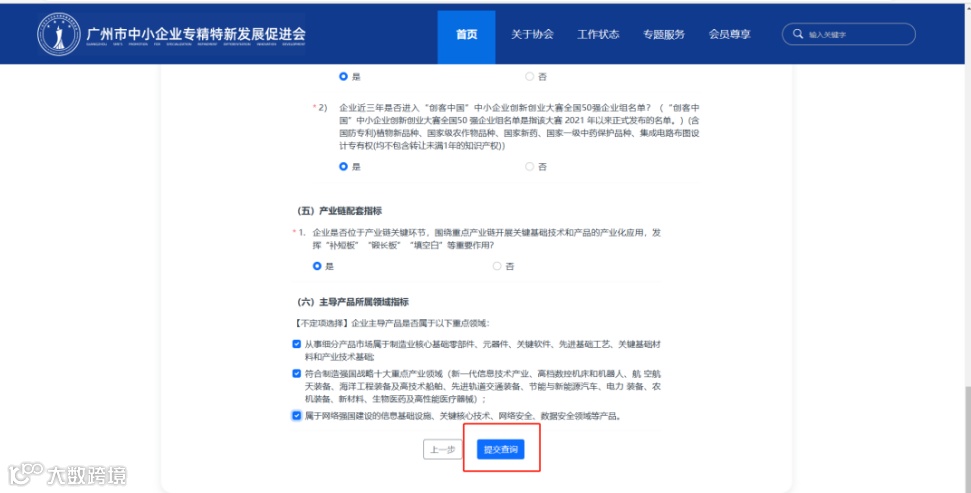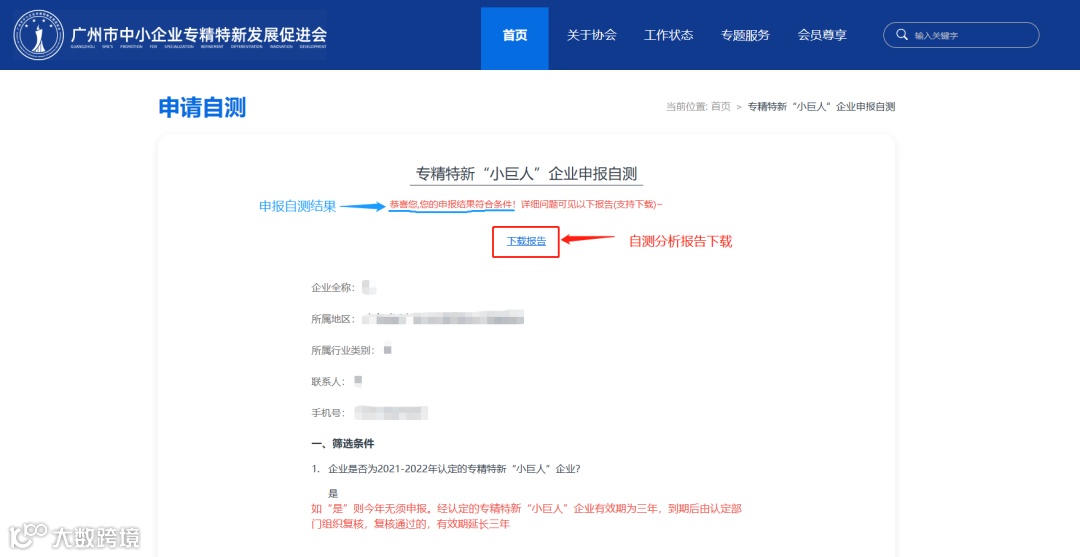 点击提交查询后,页面自动跳转到下方页面,请企业仔细查阅自测结果和分析报告,点击“下载报告”保存“小巨人自测表”。