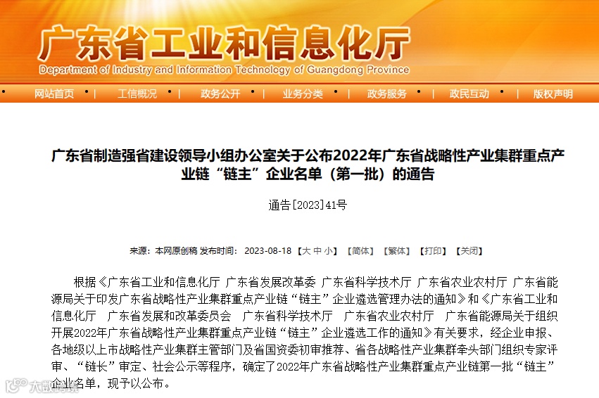 根据《广东省工业和信息化厅 广东省发展改革委 广东省科学技术厅 广东省农业农村厅 广东省能源局关于印发广东省战略性产业集群重点产业链“链主”企业遴选管理办法的通知》和《广东省工业和信息化厅 广东省发展和改革委员会 广东省科学技术厅 广东省农业农村厅 广东省能源局关于组织开展2022年广东省战略性产业集群重点产业链“链主”企业遴选工作的通知》有关要求,经企业申报、各地级以上市战略性产业集群主管部门及省国资委初审推荐、省各战略性产业集群牵头部门组织专家评审、“链长”审定、社会公示等程序,确定了2022年广东省战略性产业集群重点产业链第一批“链主”企业名单,现予以公布。