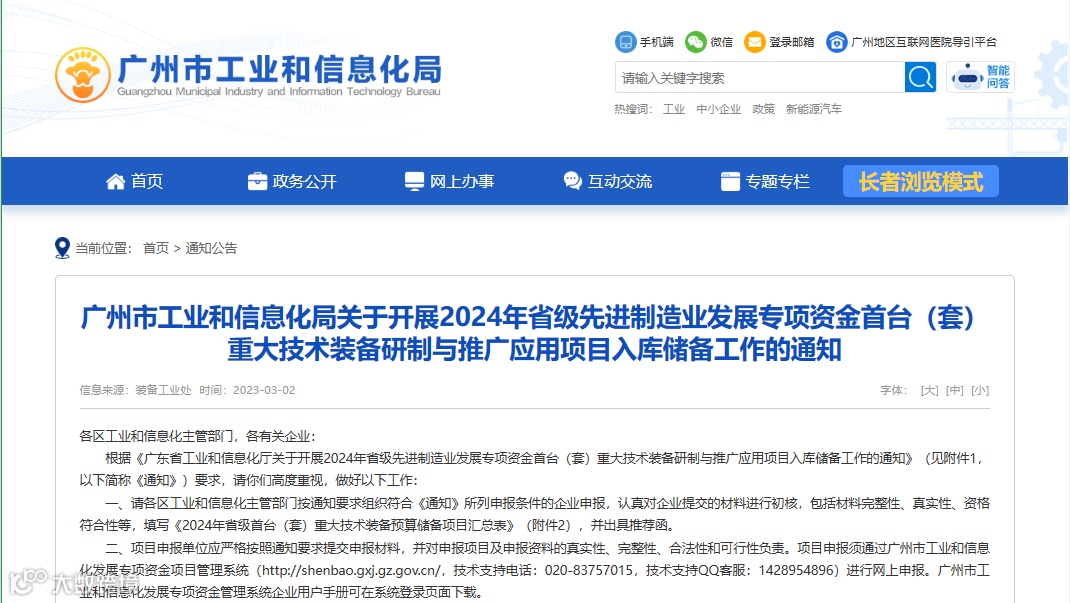 1.广东省工业和信息化厅关于开展2024年省级先进制造业发展专项资金首台(套)重大技术装备研制与推广应用项目入库储备工作的通知