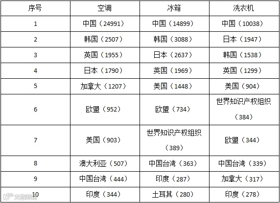 表1 空调、冰箱、洗衣机外观设计专利全球地域分布(单位/件)