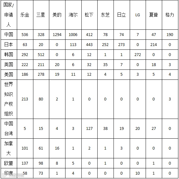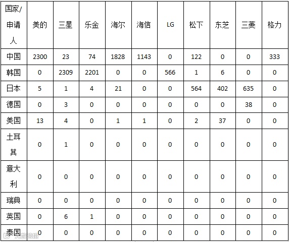 以中国为主的东亚地区在空调、冰箱、洗衣机外观设计专利申请量上占有主要地位,而在国内以东部地区(尤其是广东)占有主要地位。