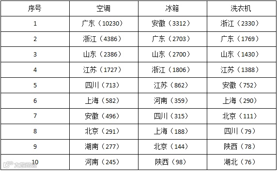 表2 空调、冰箱、洗衣机外观设计专利中国前十省市分布(单位/件)