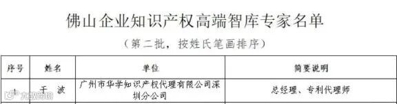 为贯彻落实《知识产权强国建设纲要(2021-2035年)》,推动佛山市产业转型升级,建设制造业高质量发展标杆城市和国家知识产权强市示范城市建设,佛山市季华知识产权发展促进中心开展征集“佛山企业知识产权高端智库”入库专家的评选活动,确定60名专家入库“佛山企业知识产权高端智库”,其中华学深圳分公司总经理于波成功入选。