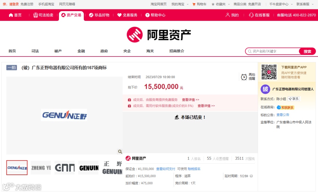 广东知名家电企业破产,名下167项商标拍拍出1550万元