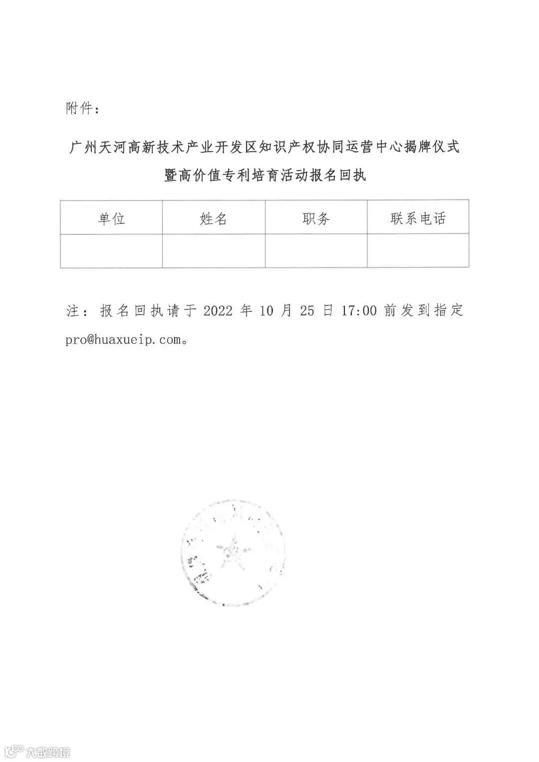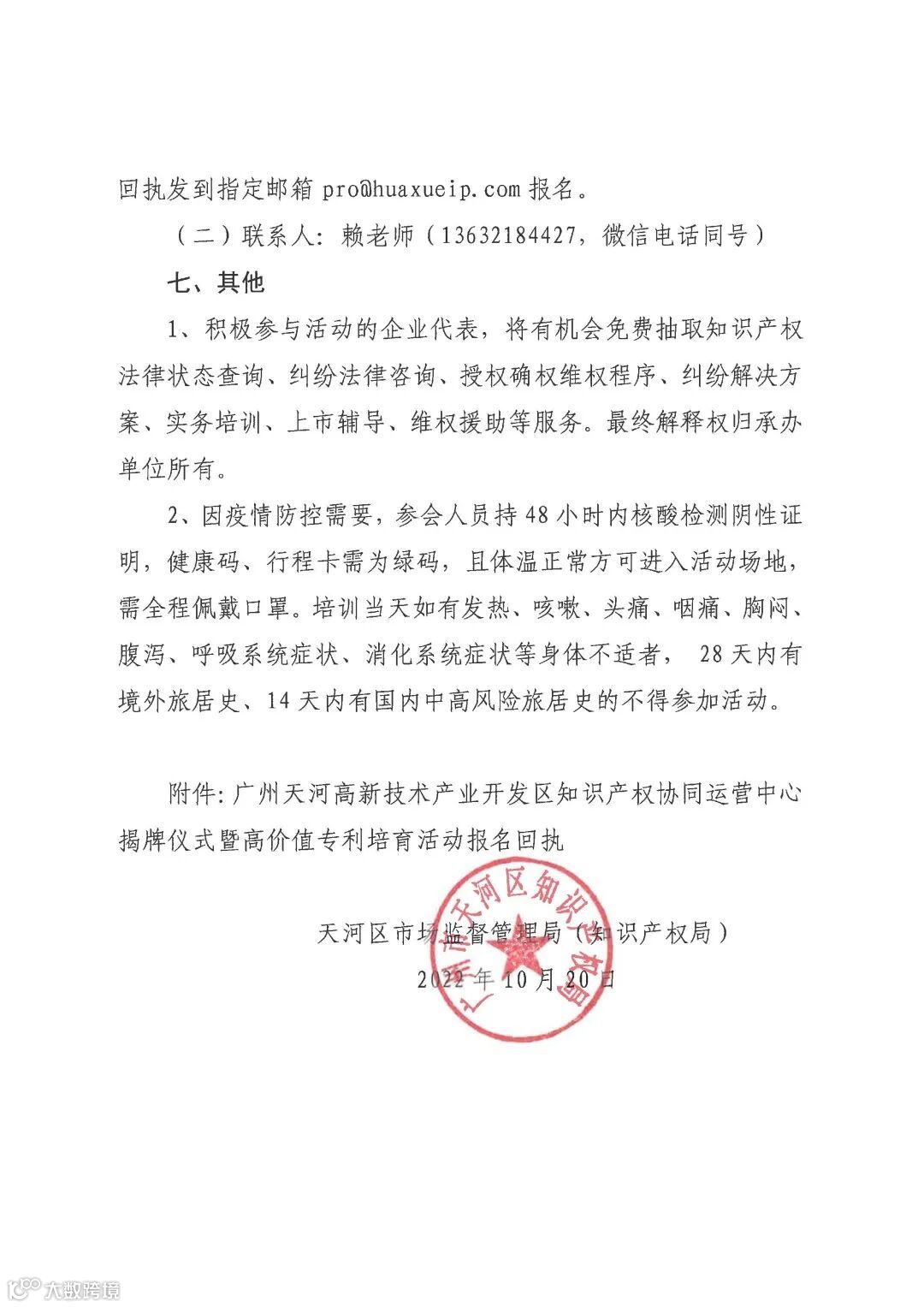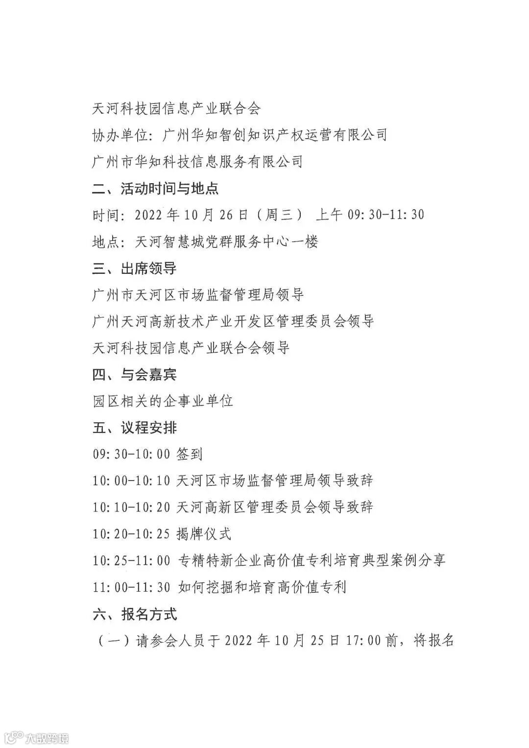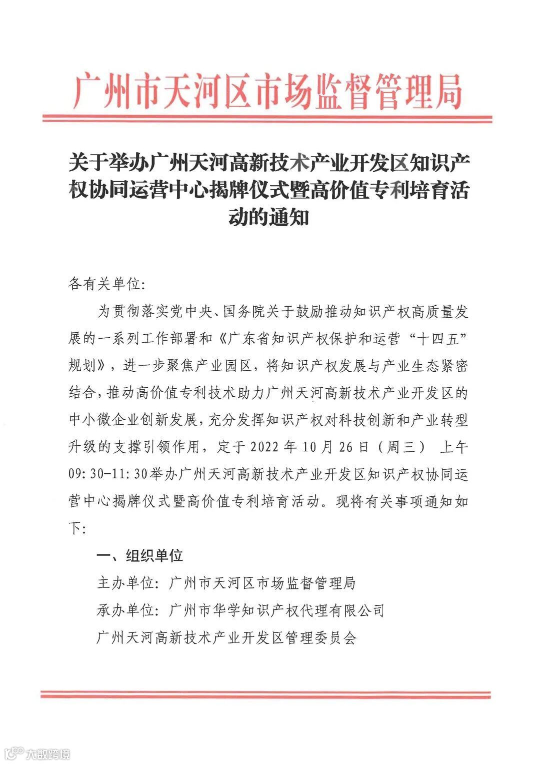 导读:关于举办广州天河高新技术产业开发区知识产权协同运营中心揭牌仪式暨高价值专利培育活动的通知