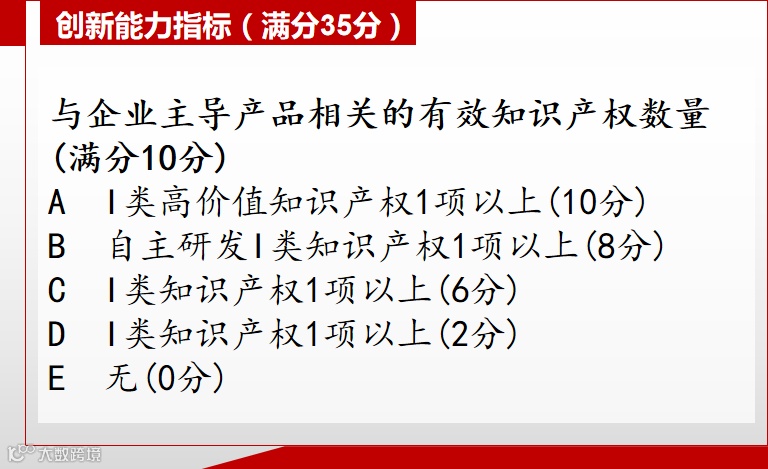 专精特新中小企业认定评价指标包括专业化、精细化、特色化和创新能力四类十三个指标,评价结果依分值计算,满分为100分。其中,创新能力指标下与企业主导产品相关的有效知识产权数量为10分,占比10%。