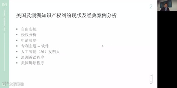 本次活动特邀澳大利亚Madderns专利商标事务所合伙人梁健祥律师担任课程主讲嘉宾。梁健祥律师有着极强的电学专业背景及近15年的执业经验,为客户提供多项海外专利/商标咨询、申请、审查答复、诉讼等服务,带来了海外知识产权保护息息相关的交流主题,吸引了学员的踊跃参与。