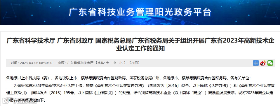 2023年我省高企认定申报在省科技业务管理阳光政务平台(网址:http://pro.gdstc.gd.gov.cn/egrantweb/,以下简称“省阳光政务平台”)开展,全年分3批次受理,每家企业只能申报1次。申报模块开放时间自2023年3月2日起。
