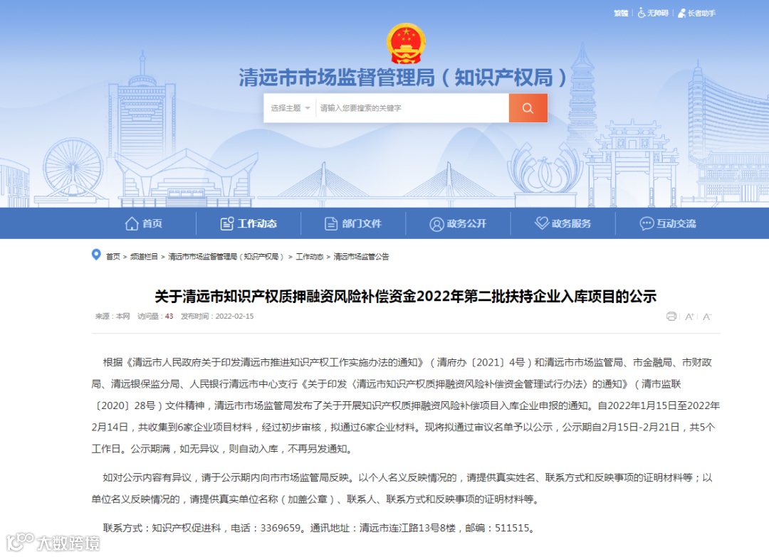 根据《清远市人民政府关于印发清远市推进知识产权工作实施办法的通知》(清府办〔2021〕4号)和清远市市场监管局、市金融局、市财政局、清远银保监分局、人民银行清远市中心支行《关于印发〈清远市知识产权质押融资风险补偿资金管理试行办法〉的通知》(清市监联〔2020〕28号)文件精神,清远市市场监管局发布了关于开展知识产权质押融资风险补偿项目入库企业申报的通知。自2022年1月15日至2022年2月14日,共收集到6家企业项目材料,经过初步审核,拟通过6家企业材料。现将拟通过审议名单予以公示,公示期自2月15日-2月21日,共5个工作日。公示期满,如无异议,则自动入库,不再另发通知。